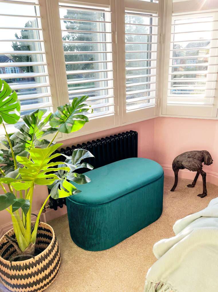 This is it now with new shutters to match the living room and yoga room ones. I’ve replaced the dressing table with a teal **pleated ottoman, artificial monstera plant in a **monochrome basket, and a quirky ostrich ornament.